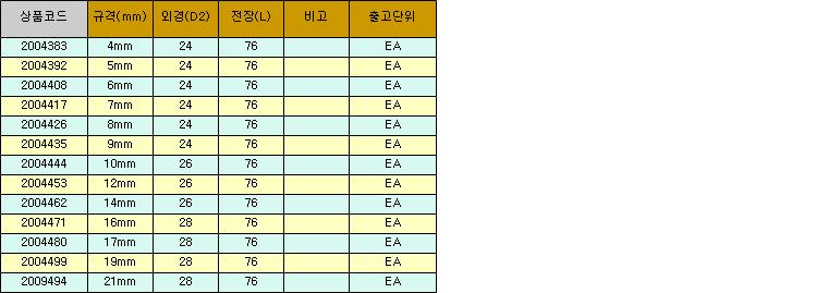 규격(mm) | 외경(D2) | 전장(L) | 비고 | 출고단위 | |