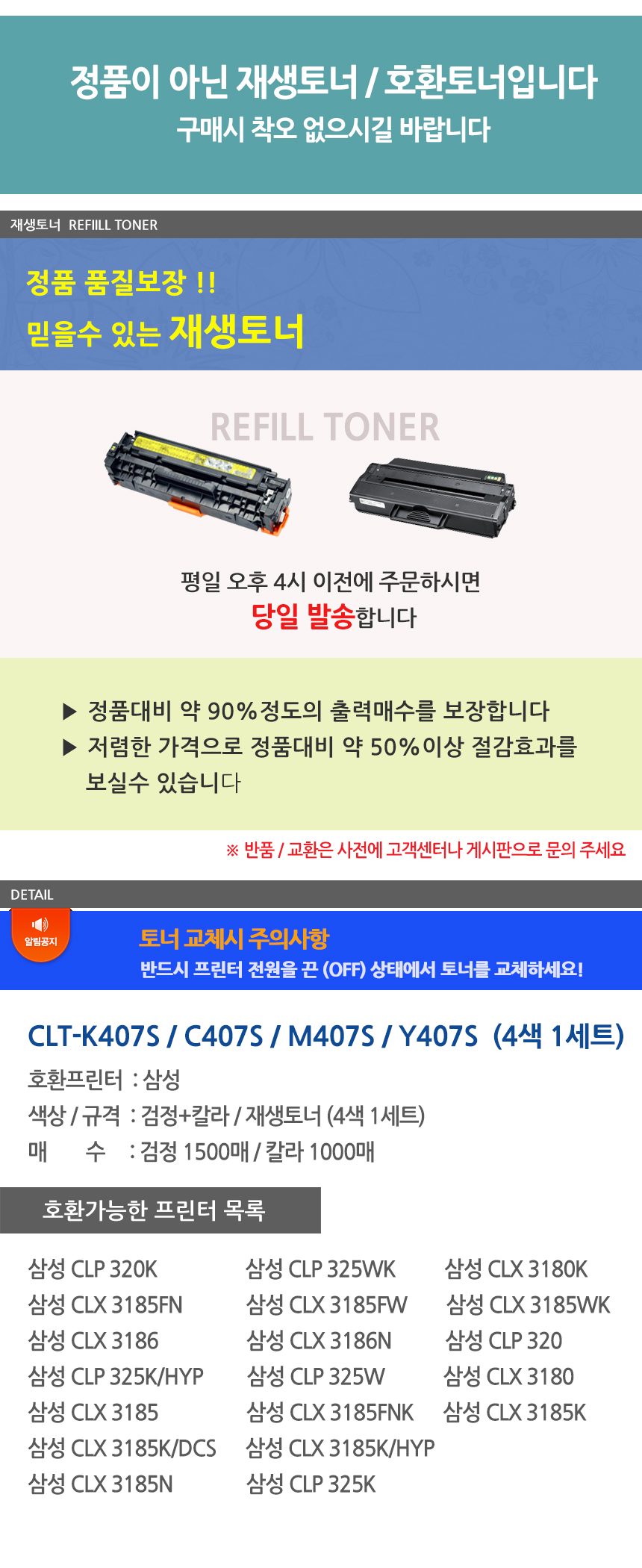 CLP-325WK 4색 1세트 CLT-C407S 재생 토너 전문 업체